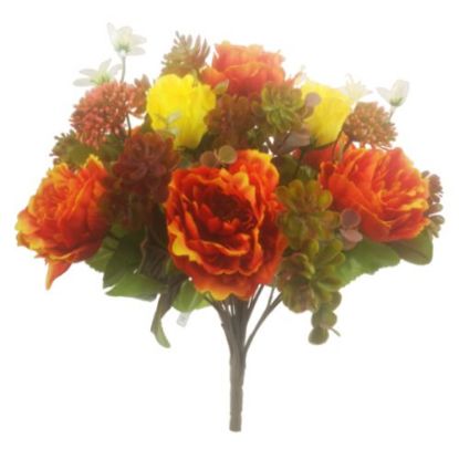 37cm PEONY ROSE AND SUCCULENT MIXED BUSH ORANGE/YELLOW